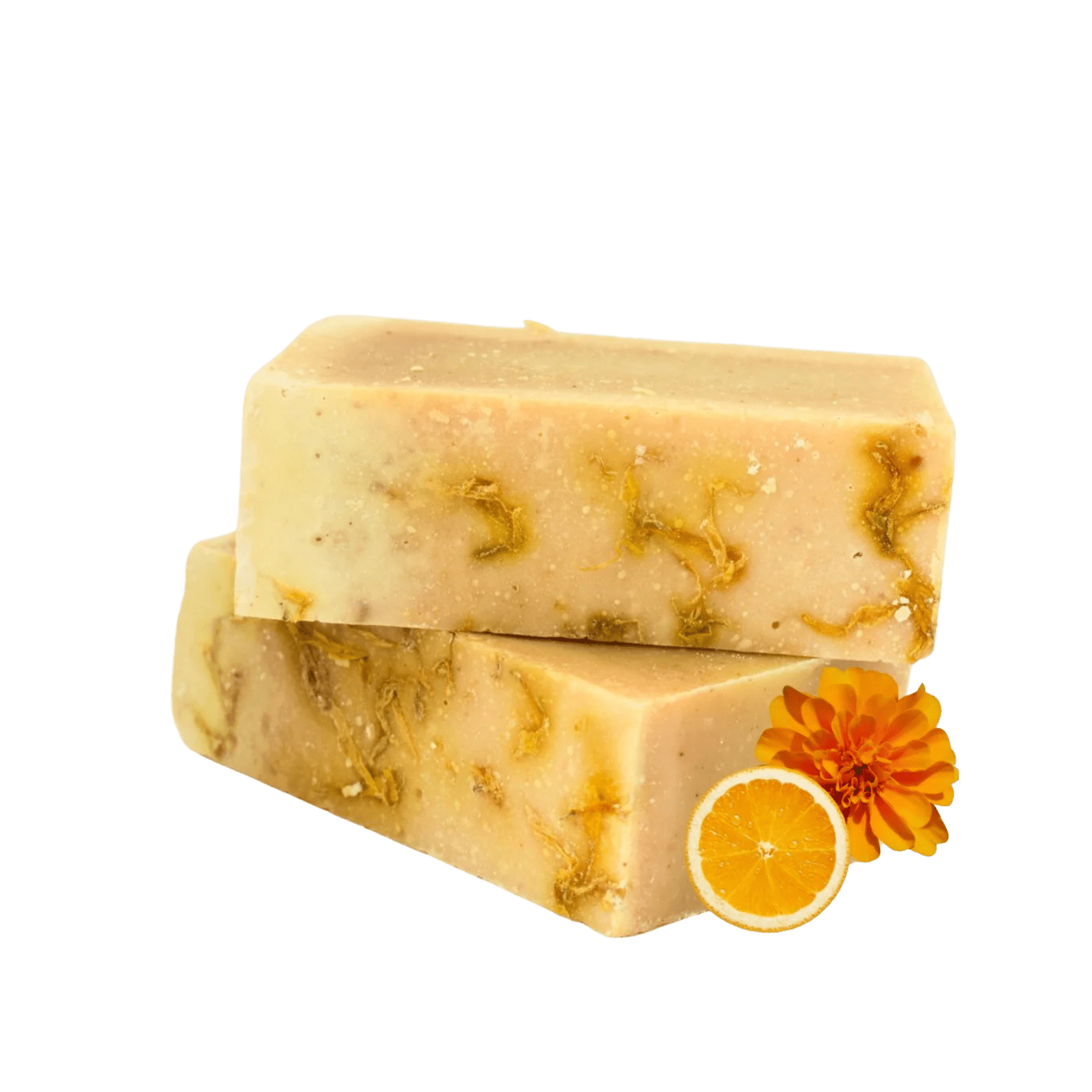 Tuhé mýdlo s esenciálním olejem ze sladkého pomeranče a měsíčkem lékařským - dvěma přírodními klenoty pro zdraví pokožky.